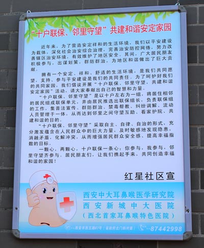 一直以来西安新城中大耳鼻喉医院开展了多次在社区义诊社区服务,提高社区耳鼻喉知识等公益活动。这次西安新城中大耳鼻喉医院将公益提升到另一个高度,不但在居民的医疗服务上且将公益扩大化,提升到居民社区安全及提升居民幸福指数。在红星社区墙体以及多个社区街道宣传“十里联保邻里相望”,共建合谐安定家园。