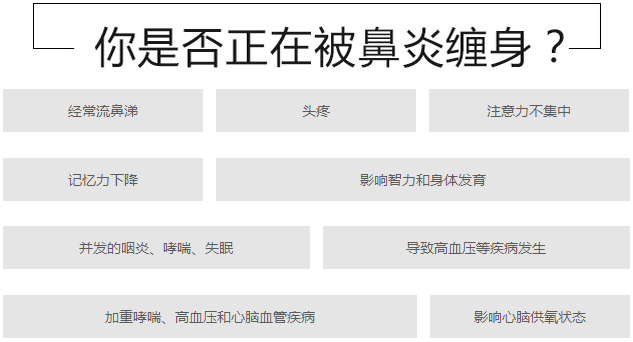 鼻炎即鼻腔炎症性疾病,鼻炎也就是鼻腔炎,是由于细菌、病毒还有各种理化因子以及某一种全身性疾病所导致的鼻腔黏膜出现炎症。主要表现为鼻腔黏膜出现充血、肿胀、萎缩、坏死等情况。鼻炎威胁我们的身体健康,常见的会导致身体出现呼吸障碍或者突发性心脏病,严重威胁了我们的生命安全。鼻炎是一种在日常生活中比较常见的一种疾病,所以在平时一定要了解鼻炎的症状。 2. 鼻涕:常有大量清水样鼻涕。 3. 鼻痒:鼻内发痒或奇痒难忍,有时外鼻、软腭、咽部、眼部、外耳道等处也发痒。 4. 鼻塞:程度轻重不一,间歇性或持续性。多数患者发作时和睡眠时加重。 5.鼻子里面疼:若遇诱发因素如受凉、淋雨、过度疲劳等,鼻腔排毒功能降低,上述细菌得以长时间停留于鼻腔内并大量繁殖,进而引发鼻炎。 6. 打呼噜:张口呼吸,出现呼吸暂停,仰卧时较严重,侧卧有所缓解,有时会憋醒。 7. 黑眼圈:眼眶下皮肤呈灰蓝色环形圈,有时具有下睑水肿。 8. 头痛及局部疼痛:鼻内粘膜肿厚及分泌物潴留压迫神经导致疼痛,常反射至头部其他各处,甚至导致记忆力减退,思想不能集中。 医生提醒,如果一段时间内经常出现耳鸣、头晕、涕中带血等症状,应尽早到医院检查确诊,排除恶变可能,以防误诊或漏诊。 ●青少年:影响智力发育和身体发育 孩子长期患鼻炎,呼吸阻塞会使大脑缺氧而引起头昏嗜睡、注意力无法集中、学习成绩下降等,对孩子的大脑,包括认知能力、记忆力和心理活动有显著的影响。另外因呼气不畅,孩子会用嘴呼吸,还会直接刺激咽腔导致咽炎,长此以往会使孩子嘴唇变厚,牙齿向外发育,导致面部畸形。 ●中年:鼻炎易导致“头痛、失眠、咽炎、哮喘” 鼻炎所引起的头晕头疼、精神萎靡、记忆力下降以及鼻涕连连形象受损外,还给生活和工作带来很大影响;长期炎症还会导致咽炎、失眠、哮喘、鼻息肉和鼻甲肥大的发病率升高;另外长期鼻塞缺氧更会导致脑梗塞、高血压和心脏病突发,尤其是易患高血压的中年人应该引起足够重视。 耳鼻喉医生推荐检查设备:卫生组织认证,“ 狼牌内窥镜”是耳鼻咽喉疾病检查的“金标准”。 由于“ 狼牌内窥镜”可通过耳鼻咽喉等部位狭小通道直接看到常规仪器检查所不能看到的病灶,并可放大数十倍甚至百倍,有助于清晰而详细地观察到周围的病变,只需要5分钟即可检测出疾病病因,辅助医师进行精准治疗,告别耳鼻咽喉疾病治疗误区,具有不易漏诊而精准治疗的优点。 温馨提示:我们由于对疾病防治意识不足,在发病初期不把它当一回事,等到疾病严重才想到治疗。任何疾病都应做到早发现、早预防、早治疗。你如果还有其他疑问,可点击【在线咨询】,或拨打健康热线:029-87401000,在线为您解答。 推荐阅读: