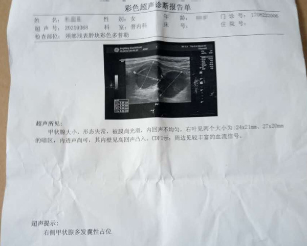 就这样,我也是抱着试试看的态度拨通了西安中大甲状腺医学029-87401000的咨询电话,那边的医生耐心的了解了我的情况,给我预约了李振国副教授。我跟妈妈一大早就赶到了西安中大甲状腺医学。经过医院专家耐心细致的分析,配合国内最先进的彩色多普勒设备检查,以及甲状腺功能五项检查,发现我的促甲状腺TSH数值高,甲状腺内血流异常,双侧多发性结节、钙化。